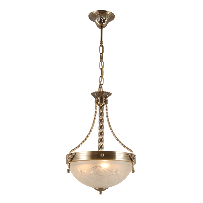 Το χάλκινο φινίρισμα με το χέρι-σκαλισμένο γυαλί γυαλί ρετρό πολυέλαιο του πολυέλαιου σώματος διαμέτρου 30 cm, σε συνδυασμό με κατακόρυφο ύψος 90 cm, χτυπά μια ισορροπία μεταξύ της οπτικής τάσης και της χωρικής αναλογίας. Με τις υποδοχές λαμπτήρων 3 × E14, υποστηρίζει βολβούς με πυρακτώδη ή LED με οδοντωτά κερί ανά πρίζα, παρέχοντας υψηλή φωτεινότητα και ικανοποίηση των κύριων αναγκών φωτισμού ενός σαλόνι 30-40 τετραγωνικών μέτρων, σπειροειδούς σκάλας ή αίθουσας συμπονετικών.